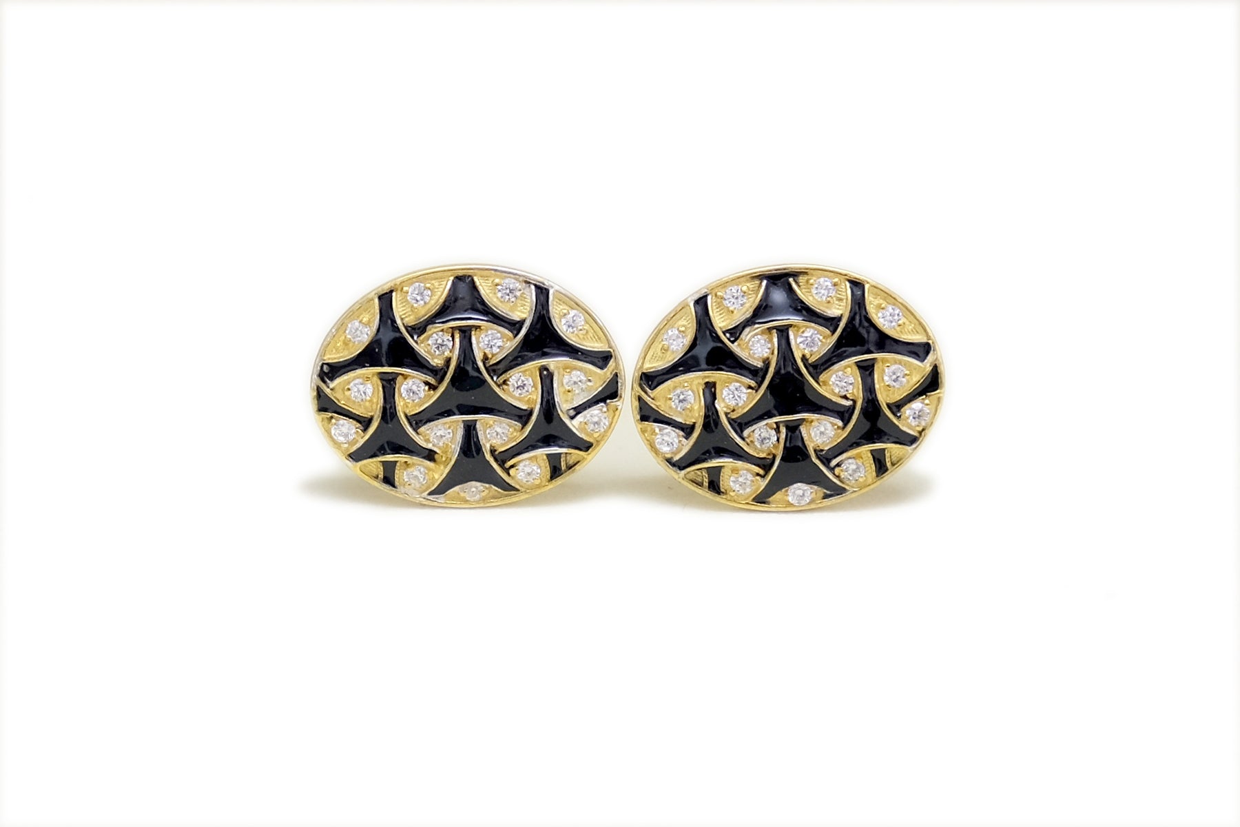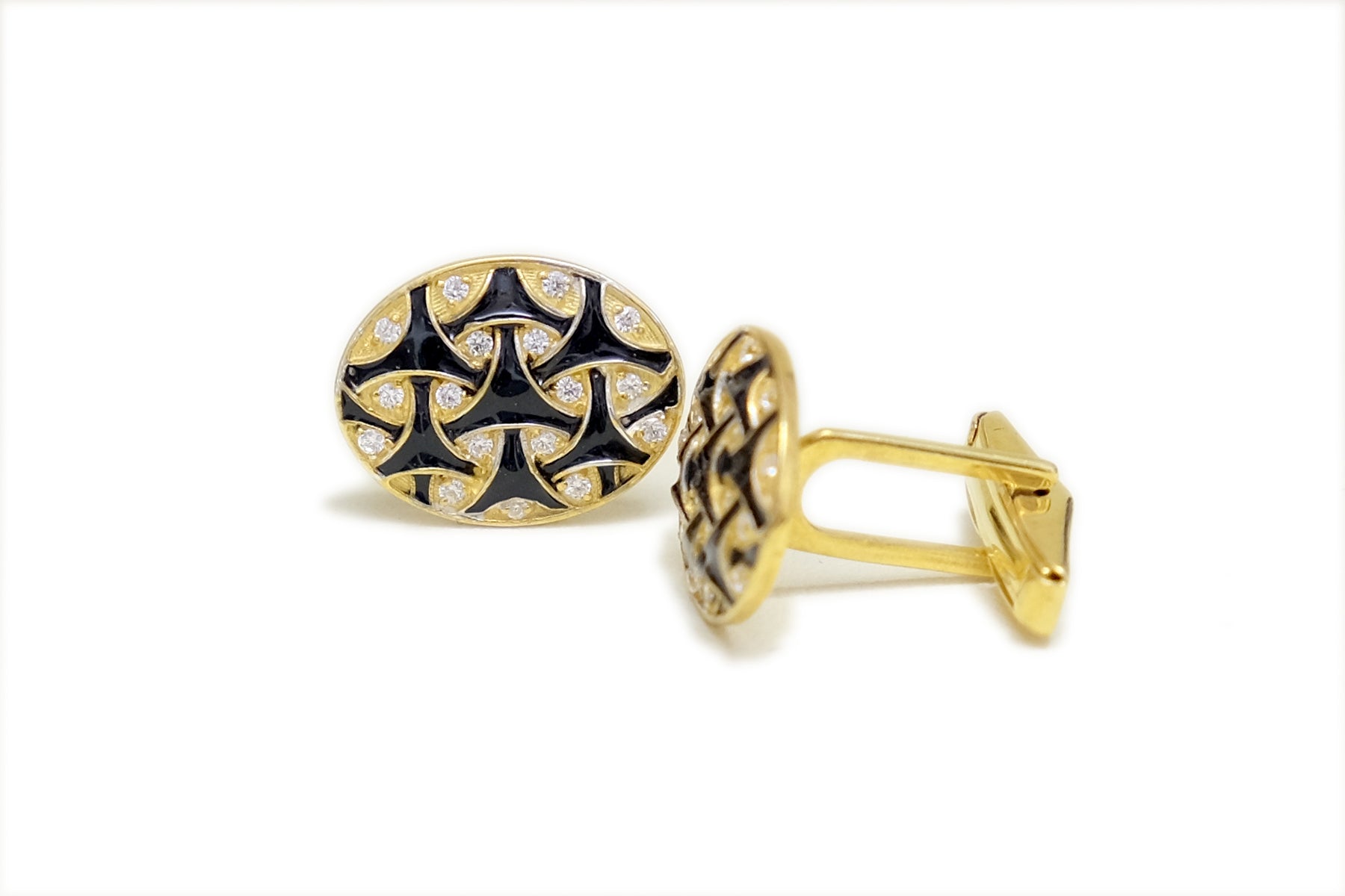 Oval art deco triangular weave deasign accentuated with cubic zirconia and royal black enamel.