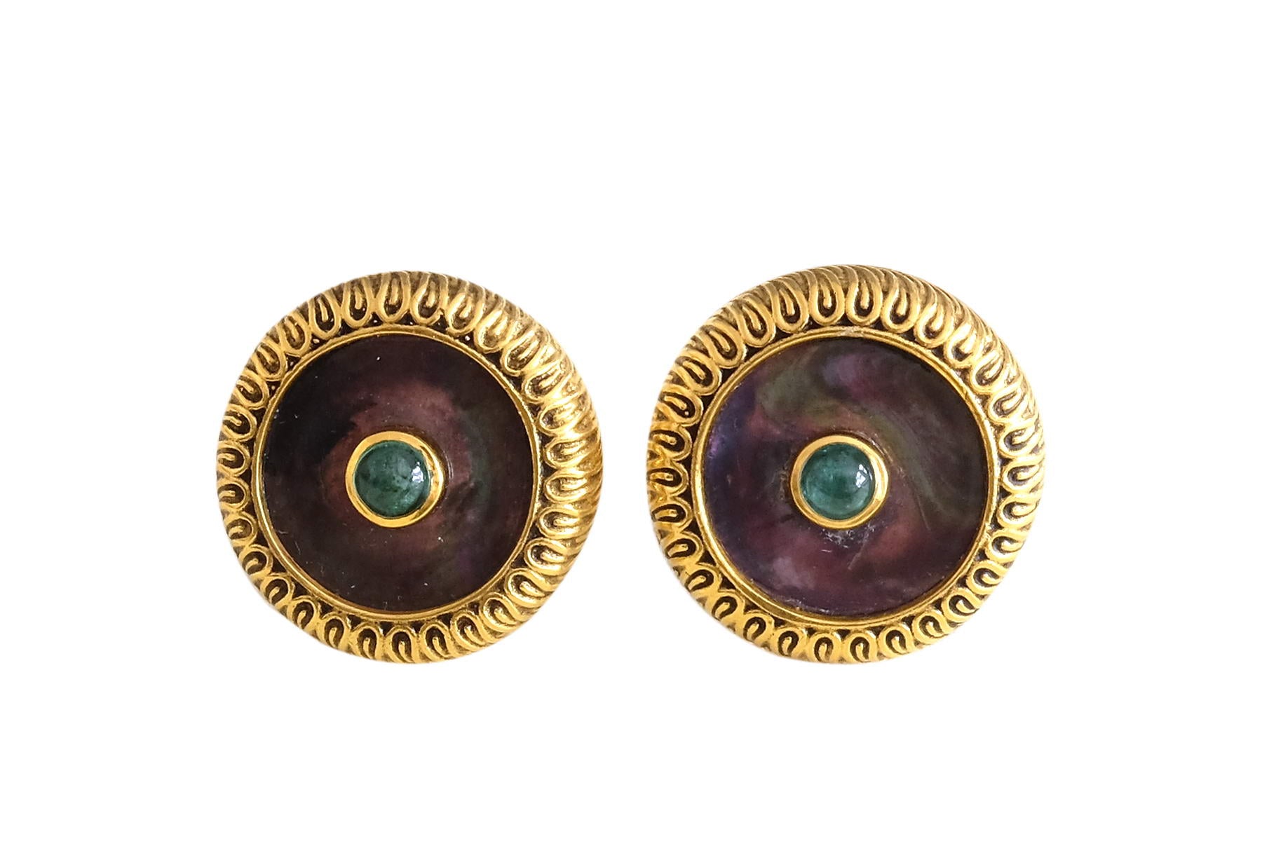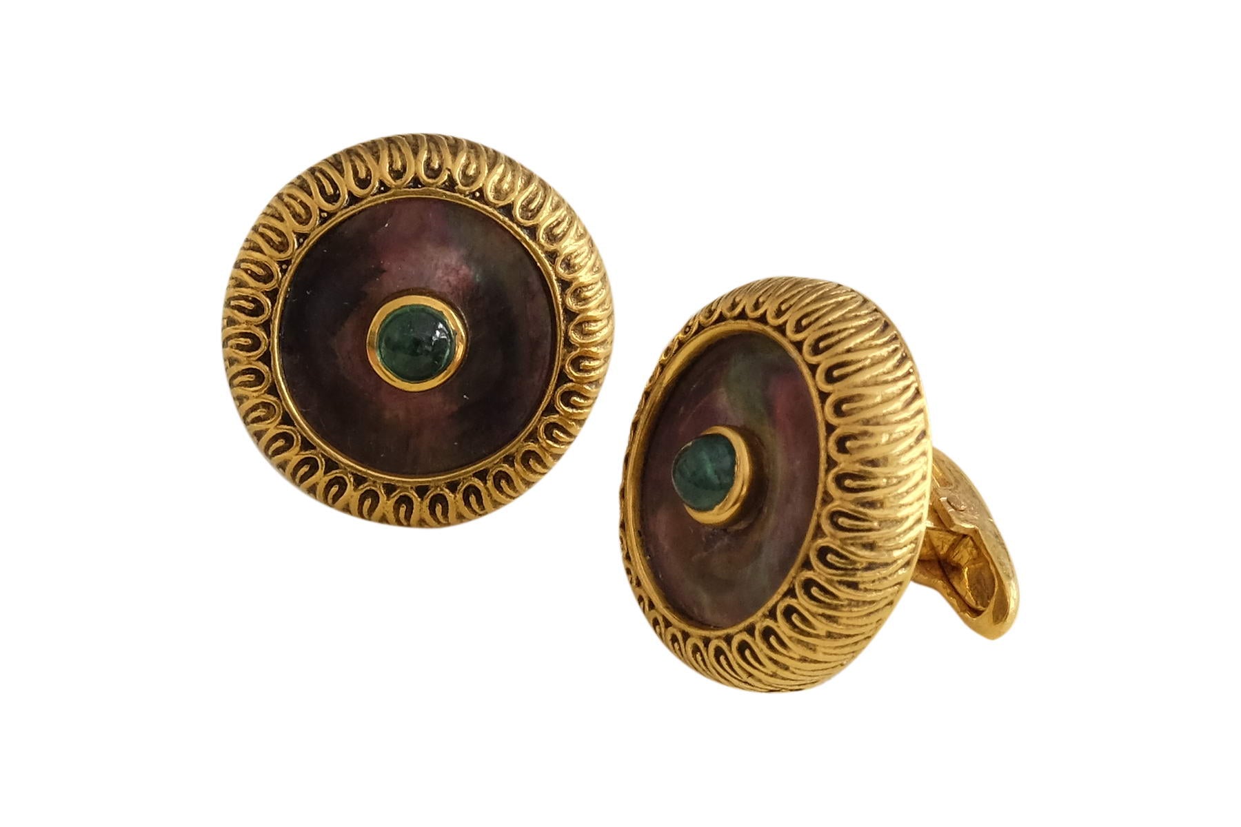 Black Mother of Pearl Cufflinks with emerald cabochon set in the centre and a filgiri border.