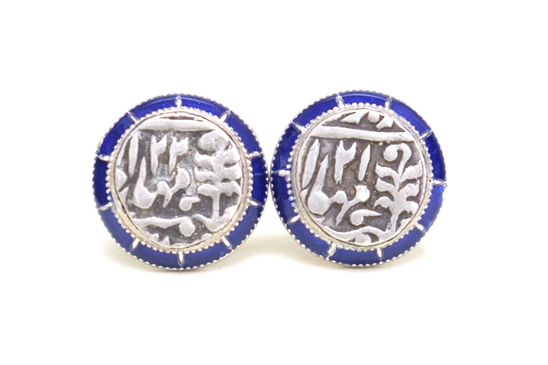 Genuine Antique 1/4 Rupee Coins from the Jaipur State set within a round case with blue enamel.