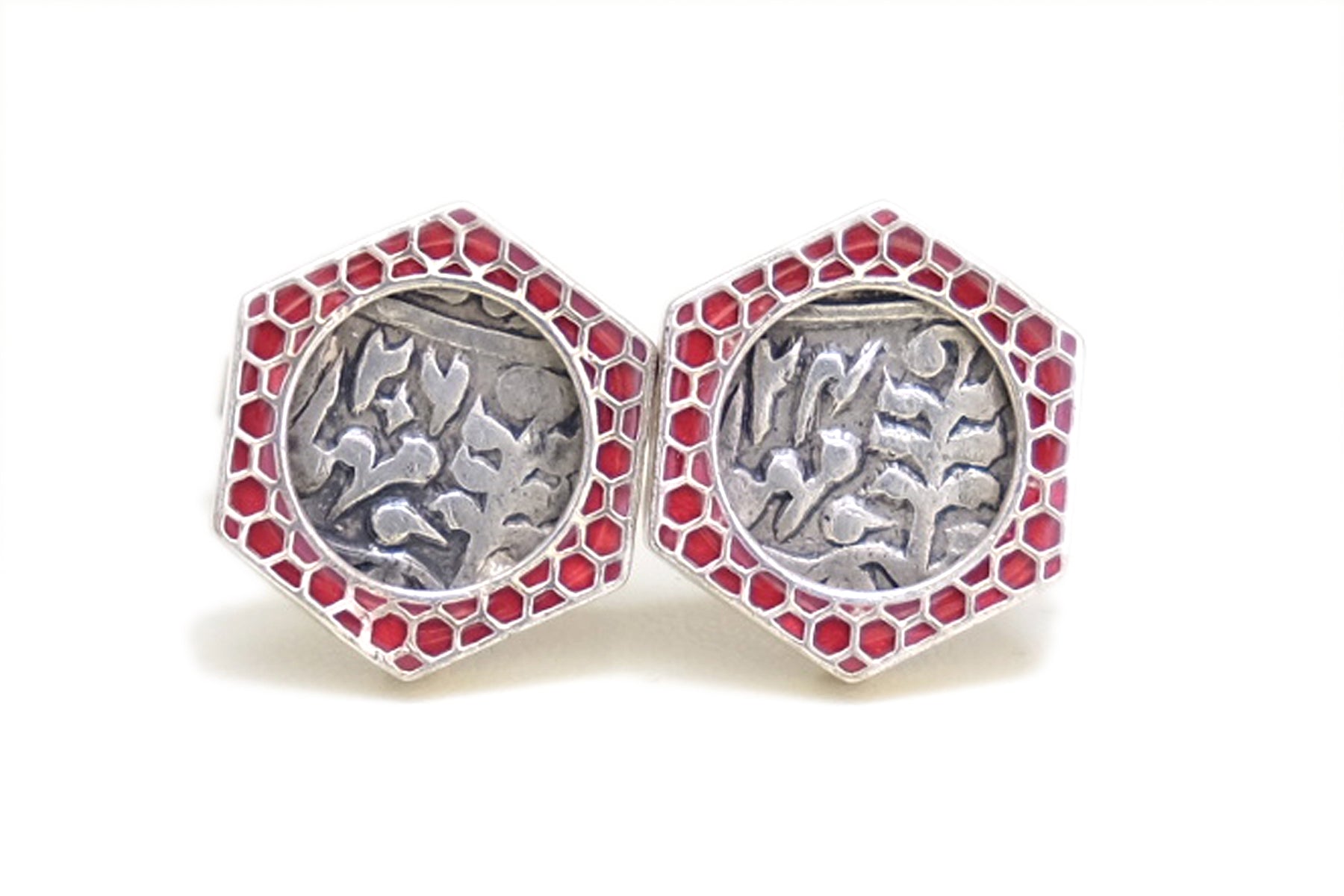 Genuine Antique 1/4 Rupee Coins from the Jaipur State set within a honey comb design case with red enamel.